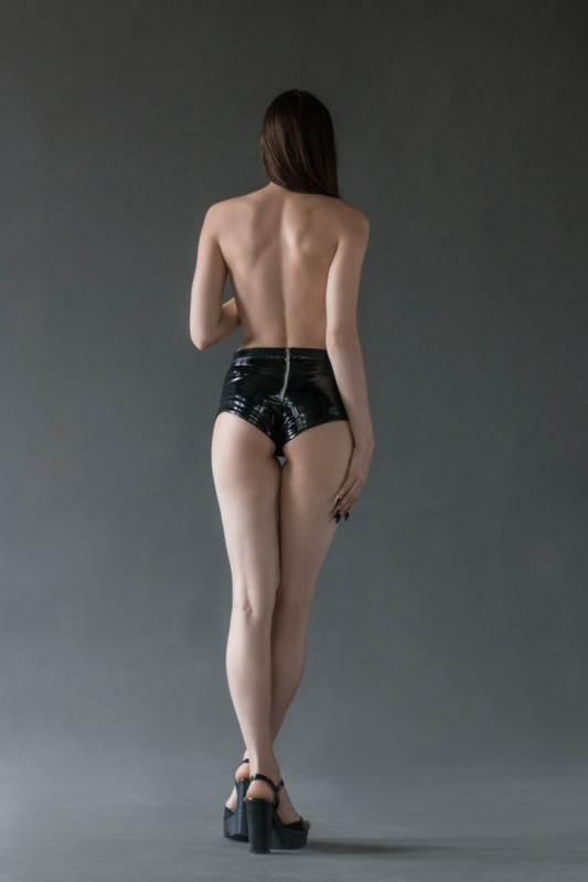 Выполнены трусики из высококачественной экокожи и винила в глубоком черном цвете. Не регулируемые. Сзади молния!