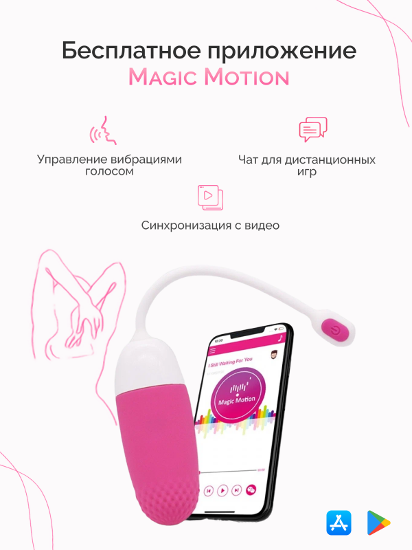 Если, использовать виброяйцо с приложением "Magic Motion", Вам откроется масса новых режимов, голосовое управление, вибрация в такт Вашей музыке, а также специальный чат, в котором Вы с партнером сможете обмениваться откровенными фото и видео!